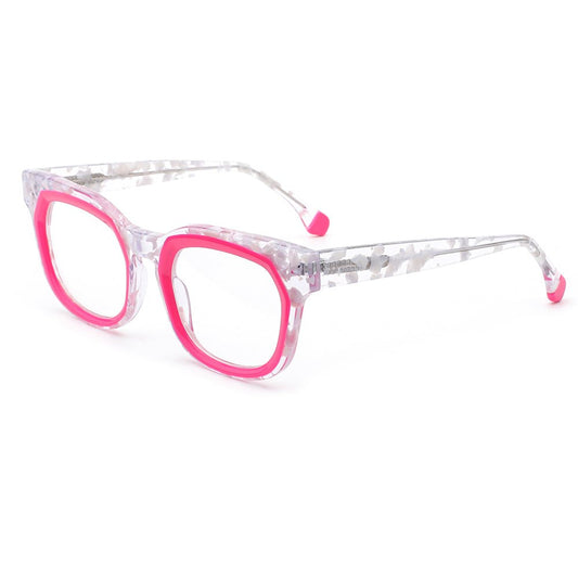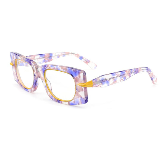 Elevate your eyewear collection with MCROONS stunning statement glasses. Crafted with a unique blend of pastel hues, the frames showcase a beautiful marbled pattern in soft purples and delicate pinks, perfectly complemented by bold yellow accents along the rims.