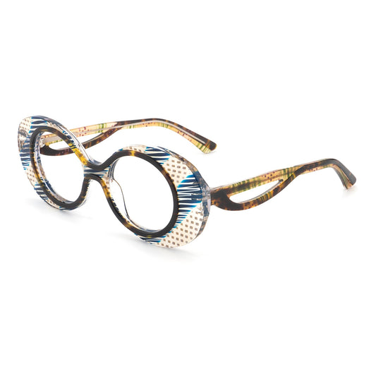 MCROONS glasses feature a striking oval design with a vibrant red frame accented by playful patterns in orange, black, and white. The clear lenses add functionality while enhancing the bold and artistic aesthetic. This retro-inspired shape makes these glasses a standout accessory for those looking to express their unique style. Ideal for casual outings or creative settings, they effortlessly blend color and flair, making a memorable fashion statement.