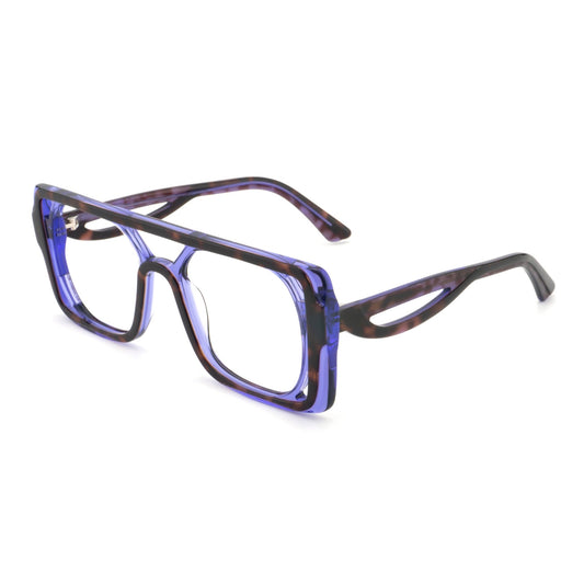 MCROONS glasses feature an oversized hexagonal design with a playful mix of purple and yellow tortoiseshell patterns. The vibrant colors and unique shape create a bold fashion statement. Clear lenses enhance visibility while complementing the artistic design. Ideal for those looking to express their individuality, these glasses are versatile enough for both casual and formal settings, effortlessly merging style with creativity.