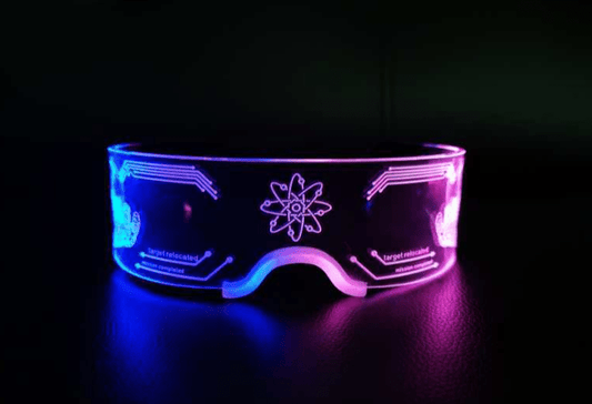 These innovative visor-style sunglasses feature a sleek clear frame accented with MCROONS vibrant red and blue LED lights, creating a futuristic and eye-catching look. The transparent lens adds to the modern aesthetic, making them perfect for festivals, nightlife, or themed events.