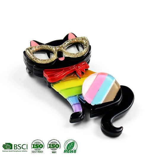 Charming Cat Brooch Show off your playful side with our Charming Cat Brooch! This adorable accessory features a stylish cat adorned with vibrant rainbow colors and trendy glasses, perfect for animal lovers and those who enjoy unique fashion statements. Key Features: Unique Design: Features a colorful cat with fun details, such as stylish glasses and a vibrant scarf. Quality Materials: Crafted from durable materials to ensure lasting wear and vibrant colors. Versatile Accessory: Great for jackets, bags, hats, or as a quirky addition to any outfit. This delightful brooch is a perfect way to express your personality and love for cats!   Add a touch of whimsy to your collection with this charming cat brooch!