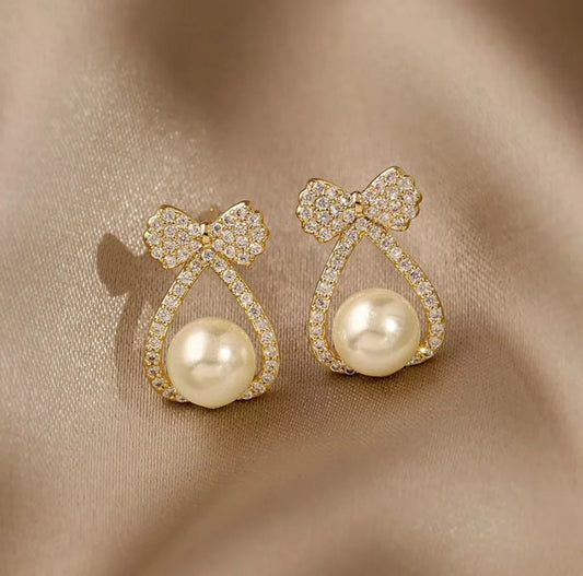 Add a touch of elegance to your jewelry collection with our Fashion Full Diamonds Bow Knot Pearl Stud Earrings. These exquisite earrings are designed to make a statement, combining classic charm with modern flair, perfect for any occasion.