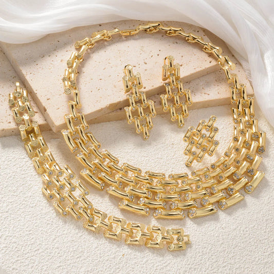 Stylish Design: A combination of gold, silver, and rose gold tones, this set includes a necklace, bracelet, rings, earrings, and a watch, providing a complete look.